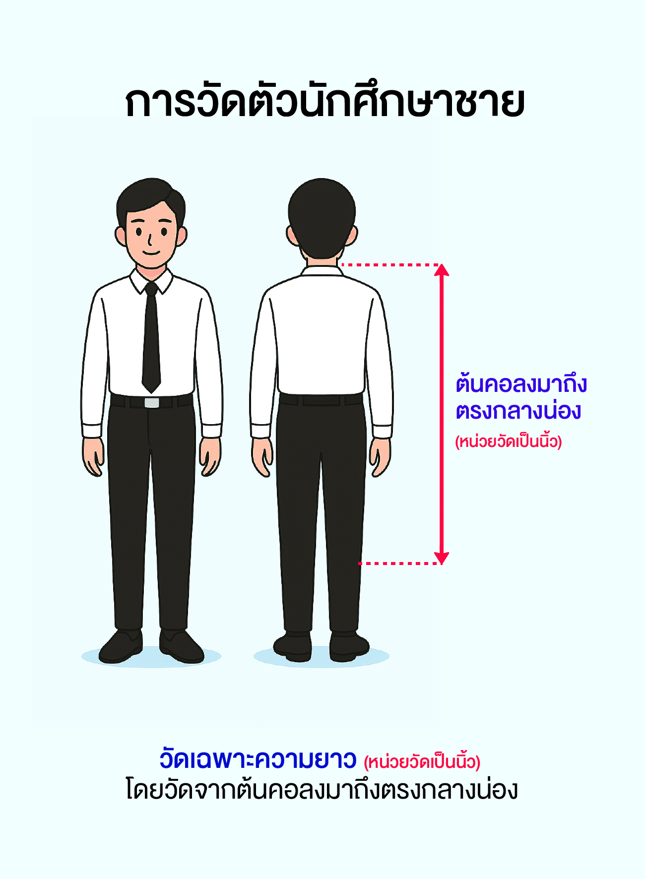 จะวัดเฉพาะความยาวโดยวัดจากต้นคอลงมาถึงตรงกลางน่อง A